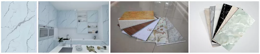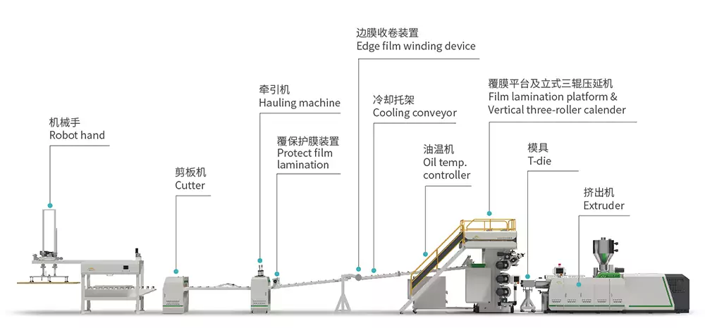 Composition of this PVC marble / UV board production line: Conical twin – screw extruder, T-die, vertical three – roller calender (including online laminating), cooling rollers, traction and edge – trimming device, shearing machine, sheet – lifting machine etc