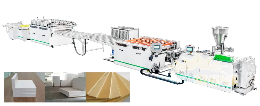 Our PVC foam board machine includes the special Twin-screw extruder, mould and other auxiliary machines. We use twin-screw extruder with compact structure, superior performance. Besides the screw and barrel and die are designed by our company and made in world famous manufacturers. And use the high-performance alloy steel for professional processing. So the machine has the advantages of uniform plasticizing, stable extrusion, high output, and long life. We can supply you the best material formulation and all of technology. We have several thousand kinds of formula through 8 years’ researches. PVC crust foam board production line with big output, stable extrusion, high foaming, good and wear-resisting surface and so on.