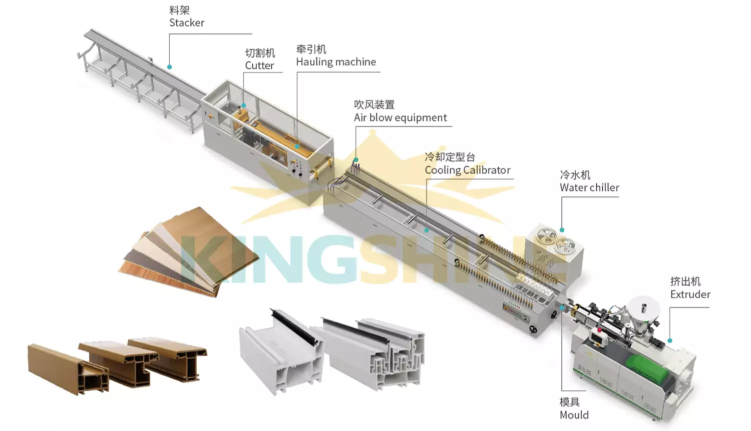 PVC profile extrusion line is mainly used in PVC door & window profile, wide door board, window board, extrusion of multi-holes tube for passing through lines ( four holes, six holes, seven holes, nine holes…etc). For different sectional surface and die head, twin parallel ( conical) screw extruder of different specifications can be chosen together with corresponding vacuum calibrating table, haul-off unit, cutting unit, tilter…etc. Capacity of main frame can be optionally chosen from 60-700 Kg/h. The haul-off unit has applied unique lift technique our company. Stable work, good reliability and large pulling force. Vacuum setting has applied special enlarged vortex cooling system which is good for cooling and calibrating so as to meet demand of high speed extrusion. Movement speed and drawing speed of cutting machine keep synchronous. All movements are controlled by imported PLC, the design is reasonable, the operation is stable, also it can conduct automatic cutting with fixed length. Powder & dust suction device can be provided. With different die tooling, the tilter platform can choose such specifications as 4 -meter, 6-meter, 8-meter, 11-meter…etc. conical twin screw extruder, it is particularly suitable for high speed extruding of profile material.